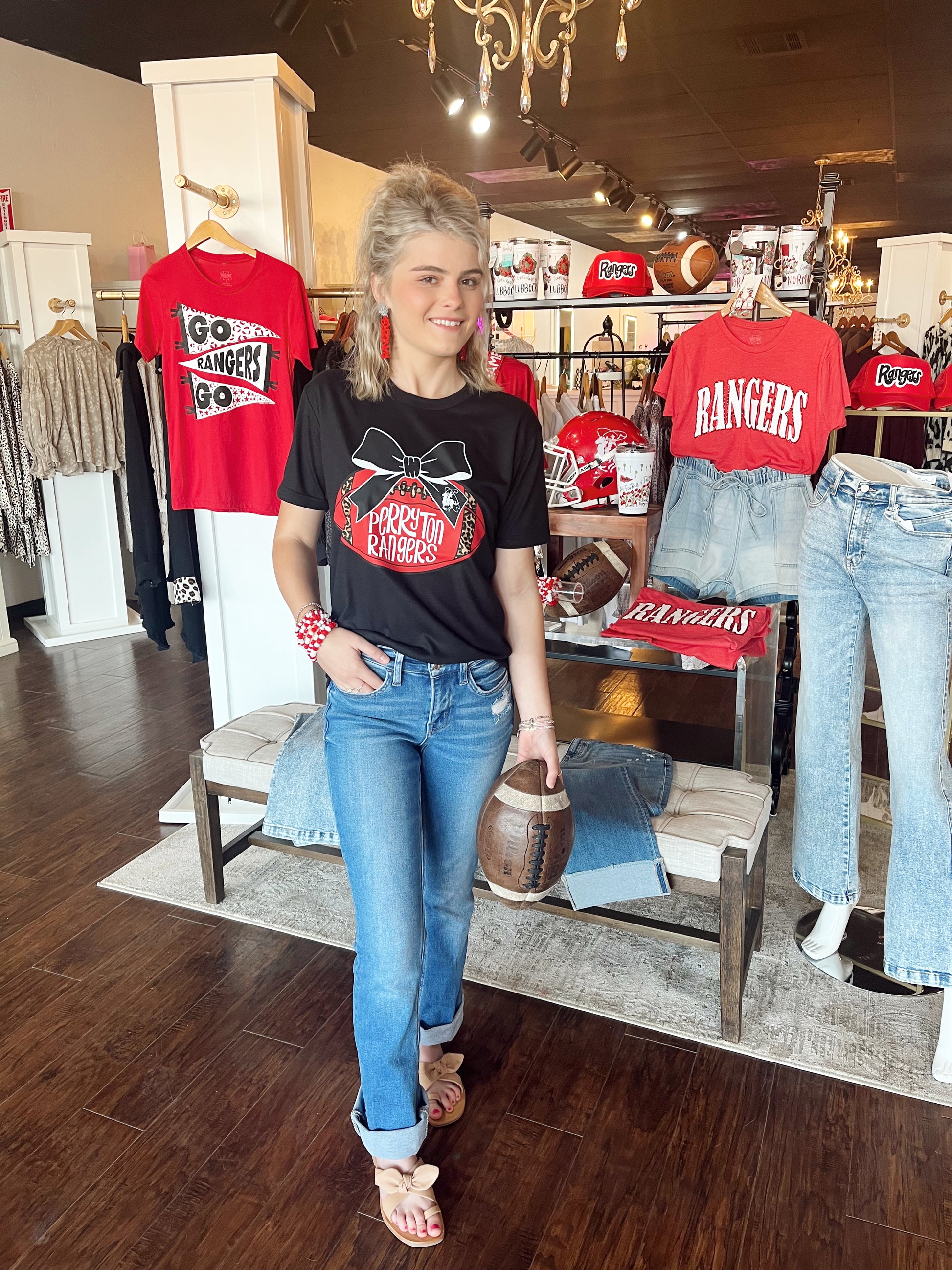 Red Football with Leopard Seams & Ranger Emblem on a Black Bow on Black Short Sleeve Tee. Cheer On the Perryton Rangers with this adorable Tee!!