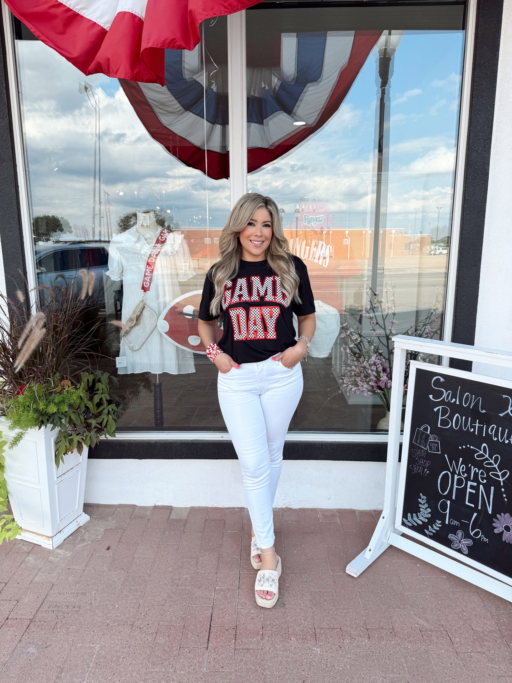 Get ready for Game Day in our Checkered Black T-Shirt!! This Tee will be a Game Day staple!
